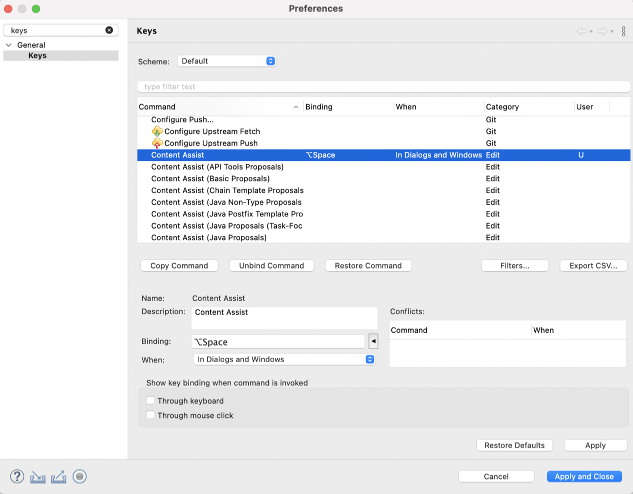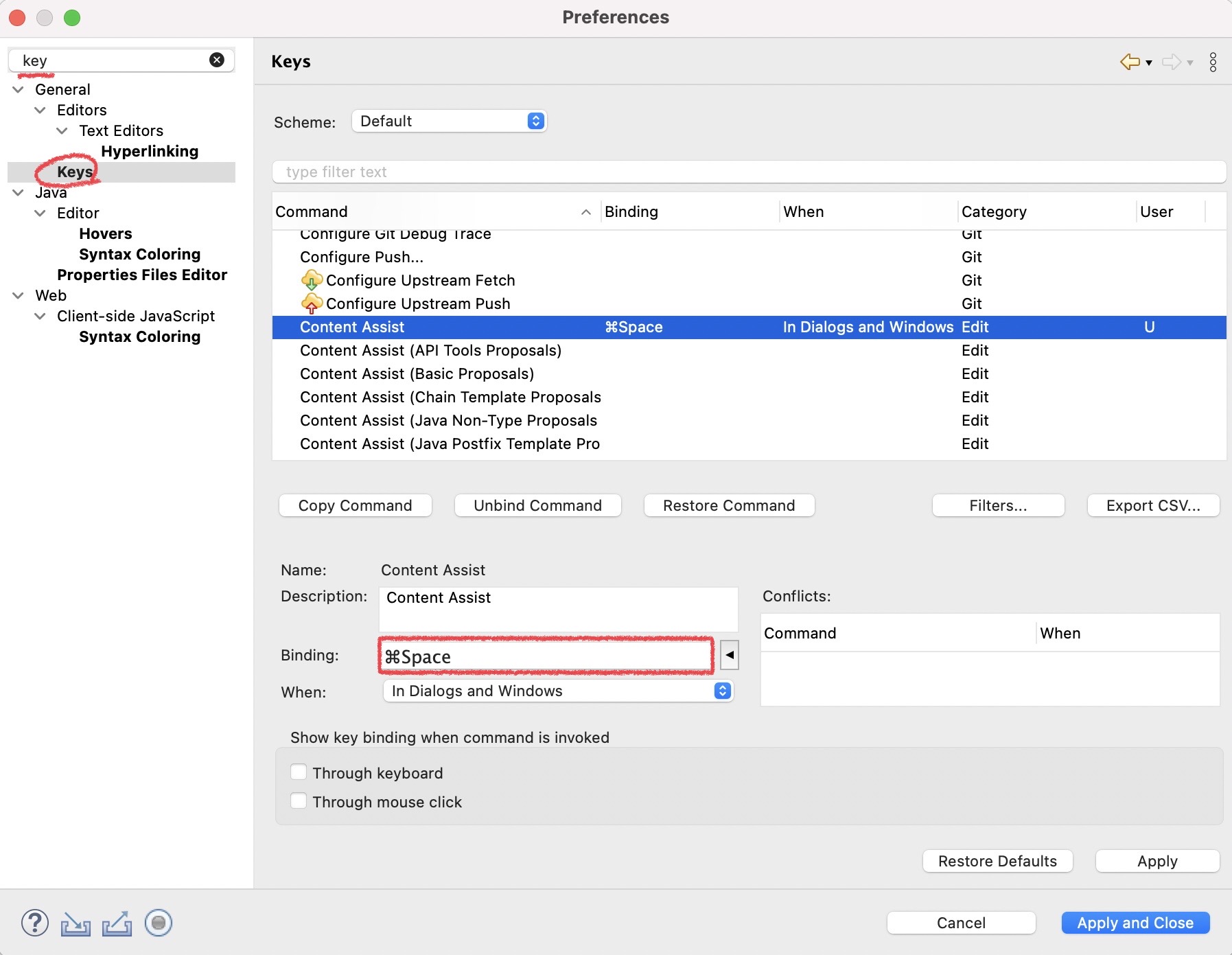 2. 좌측 상단에 Keys 라고 검색하고 그 아래 Keys로 이동한 뒤 우측에서 Content Assist를 선택합니다.