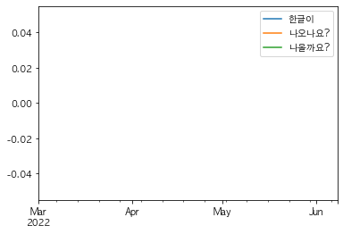 columns=['한글이', '나오나요?', '나올까요?'])