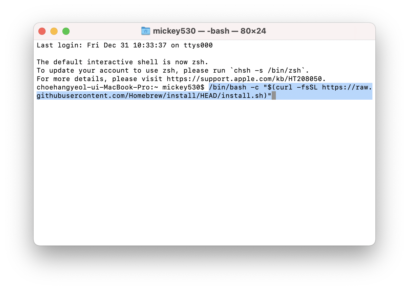 brew.sh에서 복사했던 코드를 붙여넣는다.