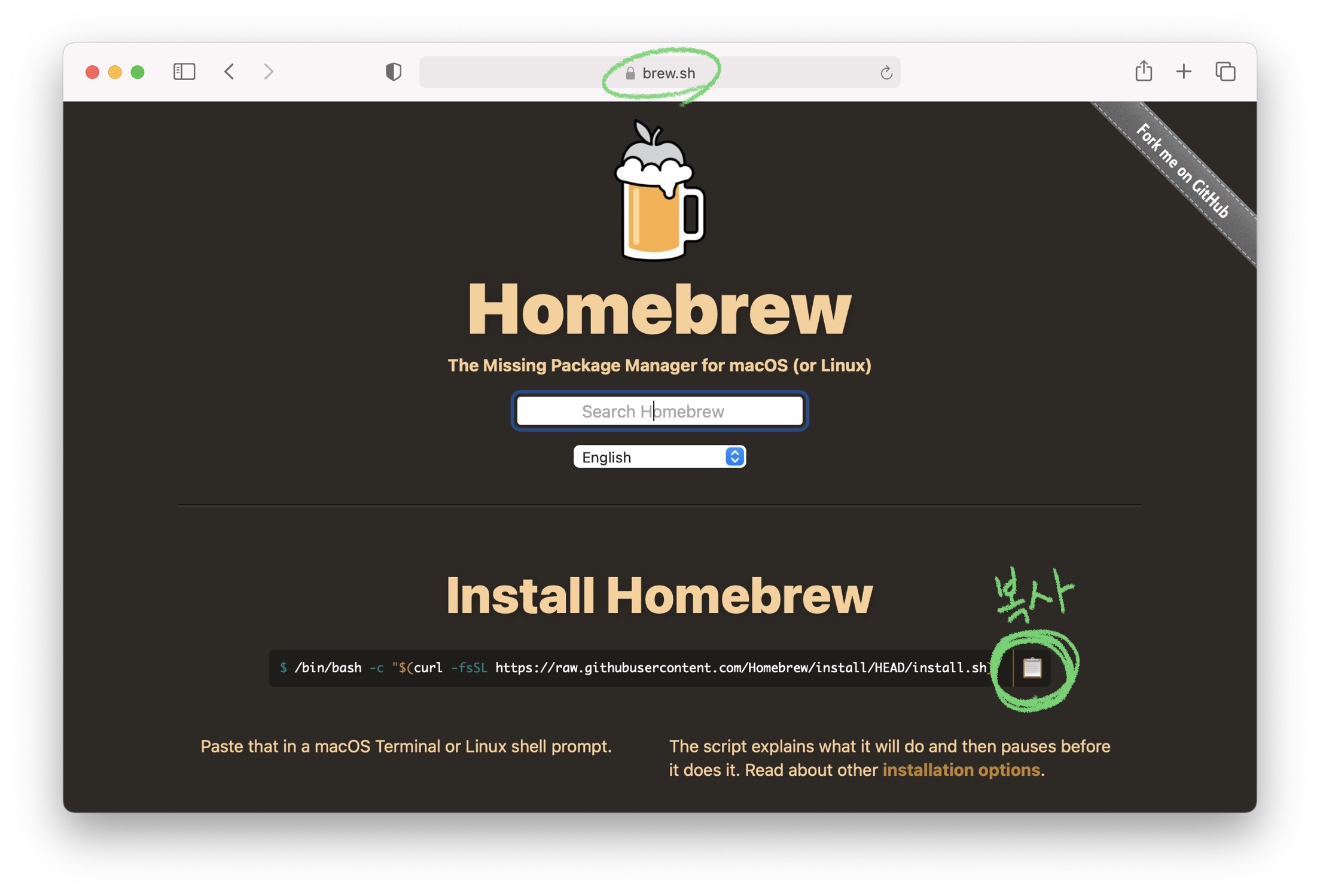 우선 brew.sh 주소로 들어와서 Install Homebrew 아래의 코드를 복사한다.