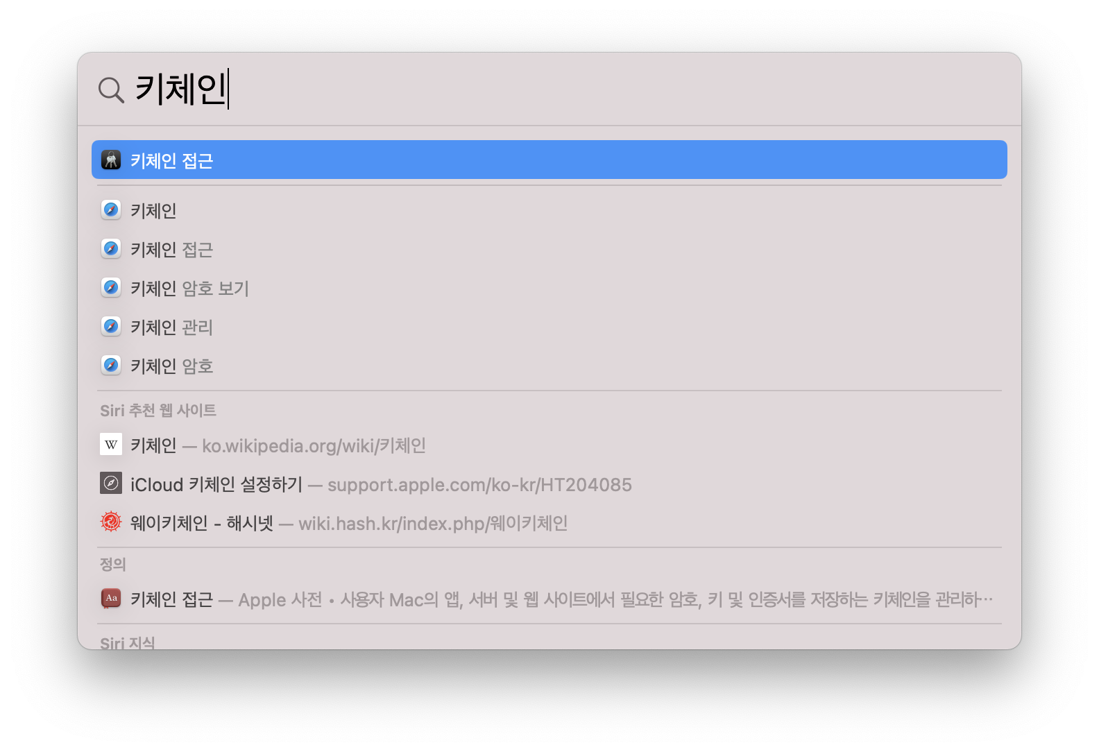 우선 스포트라이트를 켜서 "키체인 접근"으로 들어간다.